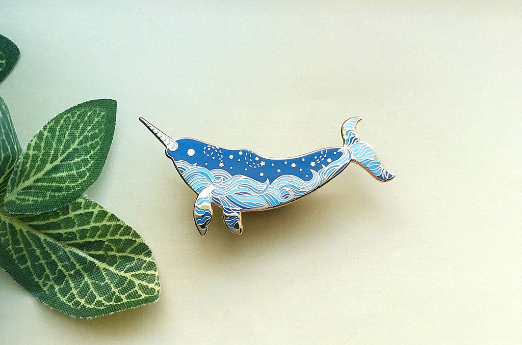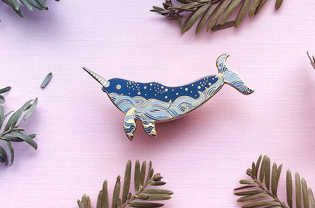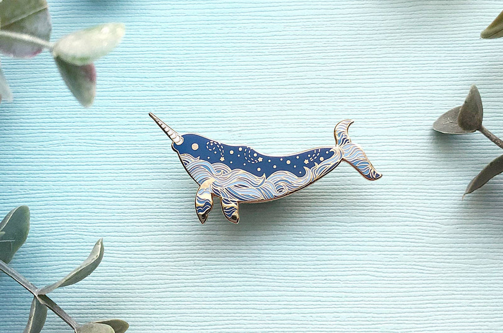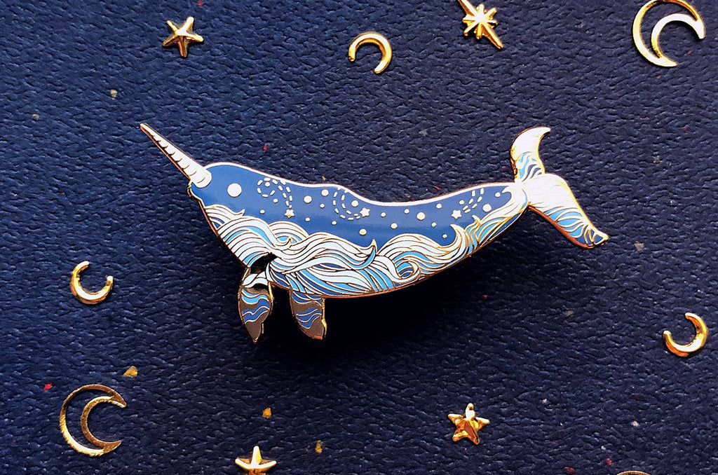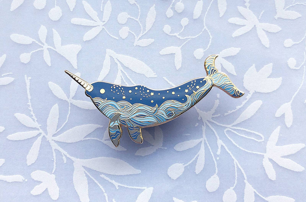 This is version two of my starry ocean narwhal pin. It is my homage to one of the most amazing animals in the ocean. Narwhals are the unicorns of the sea, this one features an ocean waves and stars design along its body. The name of this pin is, "Star Wanderer". It is a medium and light blue pin depicting the majestic narwhal with gold accents. This hard enamel pin is set on a highly-polished gold-plated metal. This starry narwhal pin is a 1.5″ piece set on a gold-plated metal featuring my original illustration of the awesome narwhal. The narwhal is a beautiful whale that inhabits the arctic waters around Canada, Greenland and Russia. This enamel pin is set with medium and light blues with gold starry accents along its body.