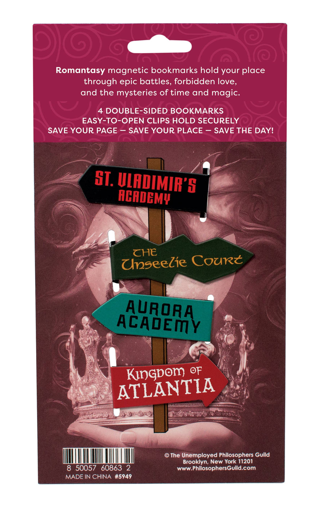 Our Literary Places double- sided magnetic bookmarks have your back. Clips to your page to hold your place, and stay firmly in place until you return. Romantasy Set features: Velaris, The Night Market, Craigh na Dun, Basgiath, St. Vladimir's Academy, The Unseezie Court, Aurora Academy, Kingdom of Atlantia