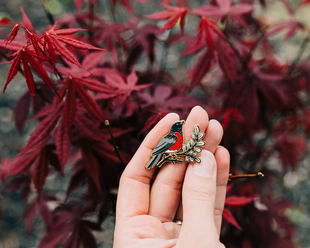 A lucky little robin enamel pin. Robins, which appear with the arrival of spring, are a symbol for rebirth and renewal. Seeing the first one hopping around at spring-time is cause for celebration, because it means the trees and flowers will soon start blooming!